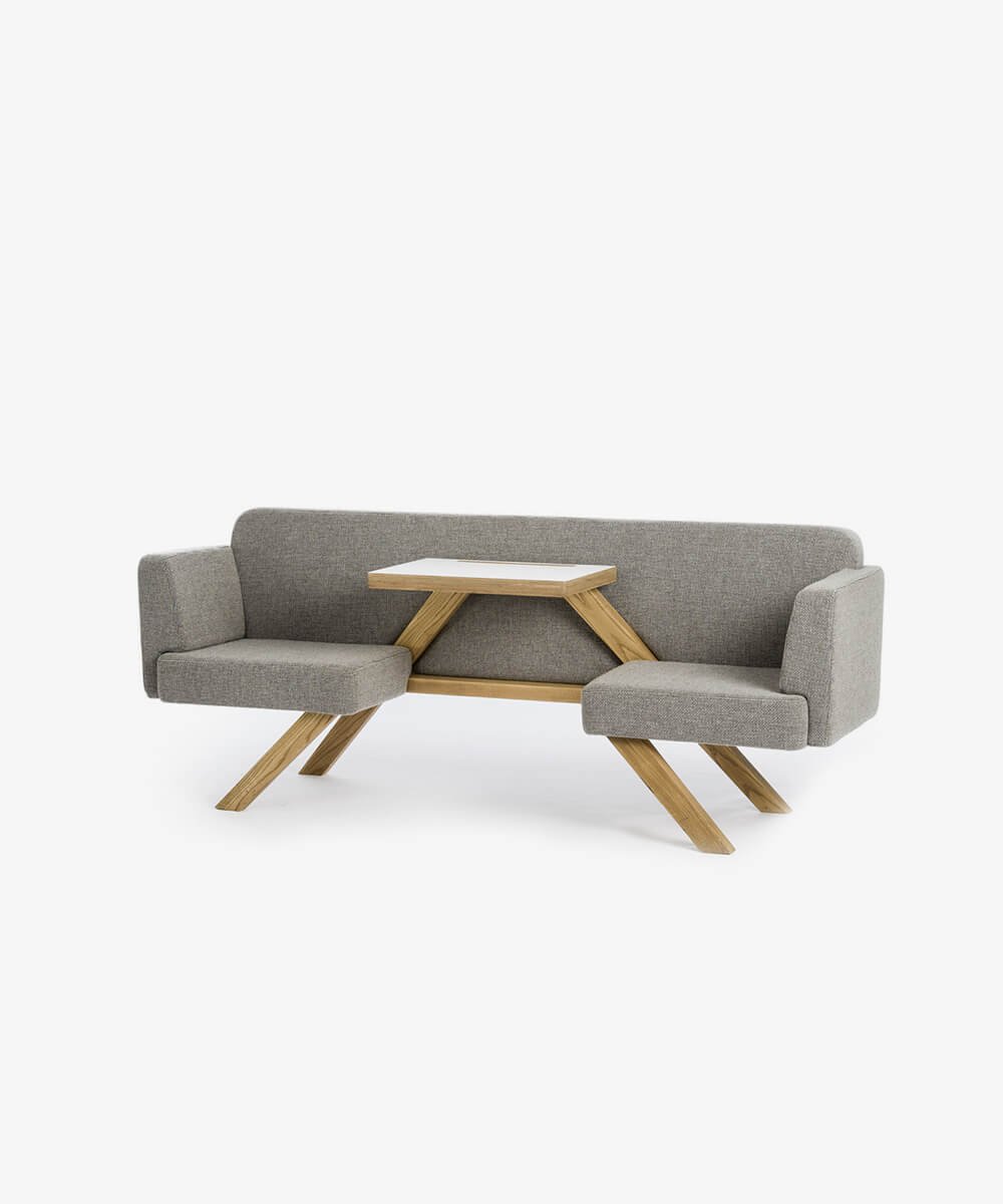 Sofa features a wide, angular shape with a wood and steel construction, carried by a slender frame of powder-coated steel. One cushion per unit is included. This version is a 3-seater configuration upholstered in a light grey or dark grey.